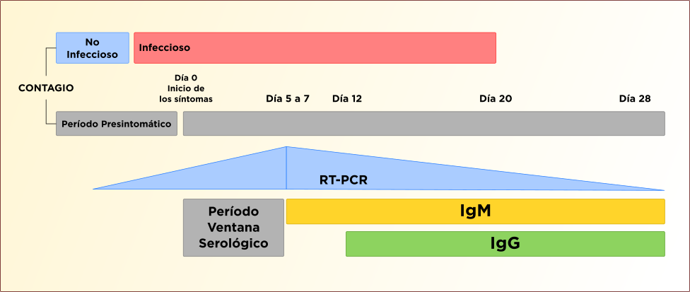 Los otros análisis utilizados para COVID-19 son la detección de anticuerpos. Las dos clases de anticuerpos que se utilizan son IgM (aparecen 5 a 7 días posteriores al inicio de los síntomas) e IgG (aparecen 12 a 14 días luego del inicio de los síntomas) pero también hay casos, aunque en menor cantidad, de aparición simultánea de ambas clases de inmunoglobulinas e incluso respuesta más temprana de IgG que IgM. Se acepta que el 100% de los pacientes habrá generado una respuesta de anticuerpos alrededor de los 20 días. La recuperación de COVID-19 podría conferir inmunidad contra la reinfección, al menos en el corto plazo y aún se desconoce si la respuesta inmune desarrollada confiere inmunidad a largo plazo. El uso de estas determinaciones tiene tres utilidades a saber: