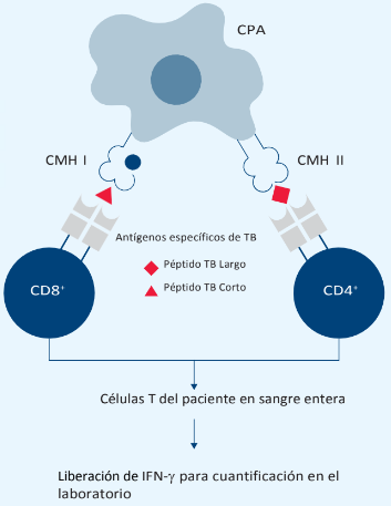 Los ensayos de liberación de interferón gamma IGRA, han demostrado tener una alta sensibilidad y especificidad para el diagnóstico de ITL. Básicamente, estas técnicas consisten en la estimulación in vitro de las células T circulantes en la sangre, mediante antígenos específicos del complejo M. tuberculosis. En el caso de que el individuo esté infectado, sus células T reconocen los antígenos y responden liberando una amplia variedad de citoquinas, principalmente interferón-gamma (IFN-γ), que se detectan en el laboratorio mediante técnicas inmunológicas.